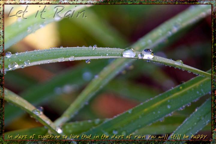 Why do we spend so much time complaining about what we do not have and so little time enjoying what we do have? Why curse the rain when we can grab an umbrella? Would not all sunshine and no rain make our world a desert? We need the rain. We need eyes with vision enough to seek the beauty that can only be found in the rain. Perhaps you find yourself in soggy circumstances; look around, you might be surprised how many extraordinary things are within your reach. Stop complaining and let it rain. Remember happiness is a choice; choose to enjoy the rain.